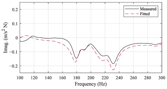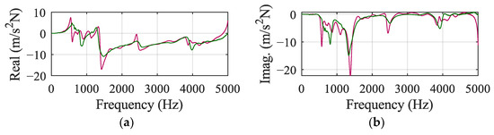 The two FRF curves show close agreement over the considered range. Furthermore, the modal characteristics extracted from the real and imaginary components of the FRF were compared for both methods. Detailed views of the real and imaginary components are shown in Figure 23 and Figure 24, respectively. Table 3 shows the modal characteristics, which were calculated based on these FRF results.