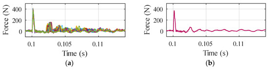 Input force magnitudes recorded on the force plate for the mechanical IG after redesign of the internal components: (a) all 50 impact trials; (b) average result of 50 trials. Each colored line in the chart depicts an individual impact trial.