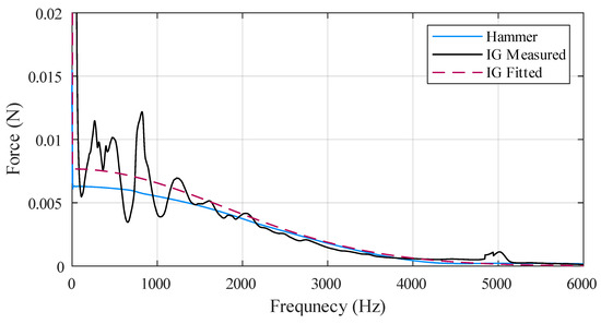 The simple mechanical design of the IG has many benefits, which were explored in Section 2.2. However, as was observed from the force plate measurements, as shown in Figure 6, the IG displayed some undesirable characteristics related to the selection of the springs and impact mass in the device. The force plate measurements collected from all 50 validation trials with the IG are shown in Figure 25a, while the average of these measurements is shown in Figure 25b. In the force plot, there were two features that deviated from the Gaussian impulse, which was expected from the IG: (1) a high-frequency oscillation observed near the initial impulse and (2) a low-frequency series of undulations that rippled after the initial impulse. The spectrum of the input force for the hammer signal, the IG collected from the force plate, and the Gaussian-fitted impulse from the IG were plotted, as shown in Figure 26, for the frequency analysis. In this plot, the high-frequency content from the IG signal was located near 5000 Hz, beyond the range of the results discussed in this study. The low-frequency undulations appeared as a broad band of spectral content in the range from 0 to 1000 Hz. The fitted impulse does capture the overall shape of the impulse resulting from the IG, which is supported by the agreement of the FRF plots observed in Figure 13. Judicious selection of the spring and mass elements inside the IG is expected to reduce the presence of these low-frequency effects, while the selection of materials is expected to be a valid method to dampen the high-frequency oscillations.