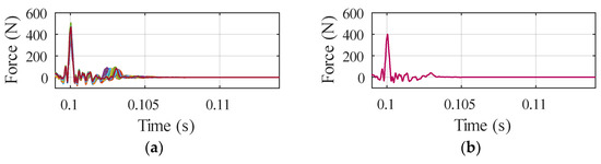 Measured force signal from 50 impulses from the IG: (a) fitted Gaussian impulse time-series; (b) force plate time-series. Each colored line in the chart depicts an individual impact trial. Each colored line in the chart depicts an individual impact trial.