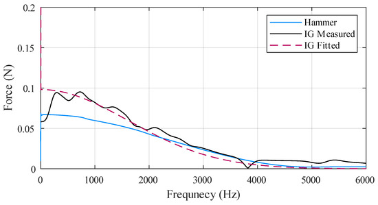 Spectrum comparison of the input force from the redesigned IG collected directly from the force plate and the Gaussian impulse fitted to the force plate measurements.