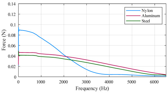 Comparison of the force spectrum for three different impact tip materials showing that harder tips excited a broader range of higher frequencies compared to the softer tip material.