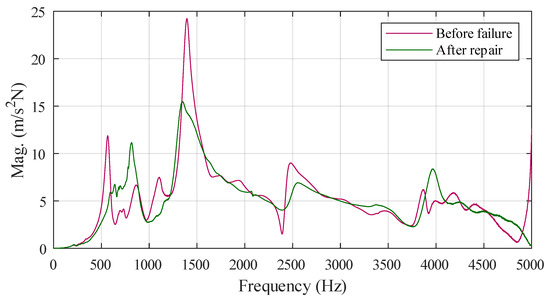 Comparison of the FRF magnitudes collected from the same machine tool spindle unit five months before a failure occurred and immediately after repair.