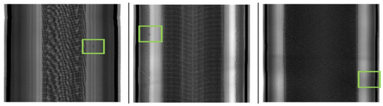 All images are labeled as defective or non-defective with the assistance of their expert quality control operators. We collected 2303 defective tire X-ray images and 49,198 non-defective tire images. The dataset used in this study contains several tire textures for different traffic modes and densities. The resolution of the collected images varied due to the wide range of tire shapes and sizes. To standardize the input, each image was resized to a resolution of 299 × 299 × 3 and normalized by dividing the pixel value by 255. Some examples of defective tire images are given in Figure 3. These are long images of tires, such as the images in Figure 1, but in Figure 3 only the defective part of each image is shown, and the foreign objects zones are enclosed in green rectangles.