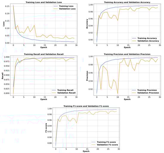 The experimental setup with the convergence rate plots was established, adding recall, precision, and F-score for the training and testing (validation) datasets. The convergence curves, which are a graphical representation that depicts the progression of the loss and accuracy over successive epochs during the training of the model, are illustrated in Figure 4. The curve illustrates the effectiveness of training and highlights potential issues like overfitting that might arise during the training process, providing an initial view of the model’s performance [27]. The curves summarize that through training epochs, the model shows a steady increase in accuracy and a decrease in loss, signifying that the model is learning and adapting to the patterns in the data. As the model approaches the final epochs of training, the curves start to display a slight upward slope with a small increment in accuracy and decrement in loss.