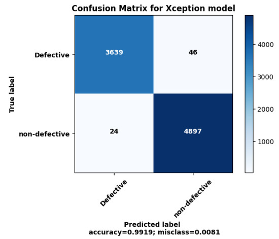 The classification results of the proposed model are depicted in Figure 5 as a confusion matrix. The positive class is considered the defective tires, and the negative class is the non-defective tires. As the confusion matrix illustrates, 3639 defective tires were correctly classified out of 3685, with 46 being misclassified as non-defective. Similarly, 4897 non-defective tires were correctly classified out of 4921, with only 24 misclassifications. In this study, when defect-free tires were found to be defective, they could be re-examined and found to be defect-free. However, if defective tires are found to be defect-free, factories can put them on sale. It is therefore important to see that 3639 of the 3685 defective tire samples were classified correctly. This indicates that the model can minimize significant errors in real-world scenarios. Furthermore, the model’s success in correctly identifying defect-free tires is noteworthy. For example, 4897 out of 4921 defect-free tire samples were correctly classified, indicating that the model is generally robust in correctly distinguishing defect-free samples.