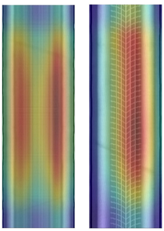 Figure 6. The heatmap using Grad-CAM of a non-defective tire (on the left) and a defective tire (on the right).