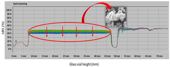 Figure 2 shows the backscattering profile variation (ΔBS) over assay time, presenting a slight difference in the curves, indicating a slow rate of nanocapsule flocculation and a destabilization phenomenon characterized by the aggregation process of one or more particles without the loss of individuality [23]. This aggregation is due to the forces of attraction between the nanocapsules and was also observed in previously obtained morphology (Figure 1). However, the nanocapsules presented good system stability since the ΔBS was 10% after 48 h and constant from a 10–45 mm vial height.