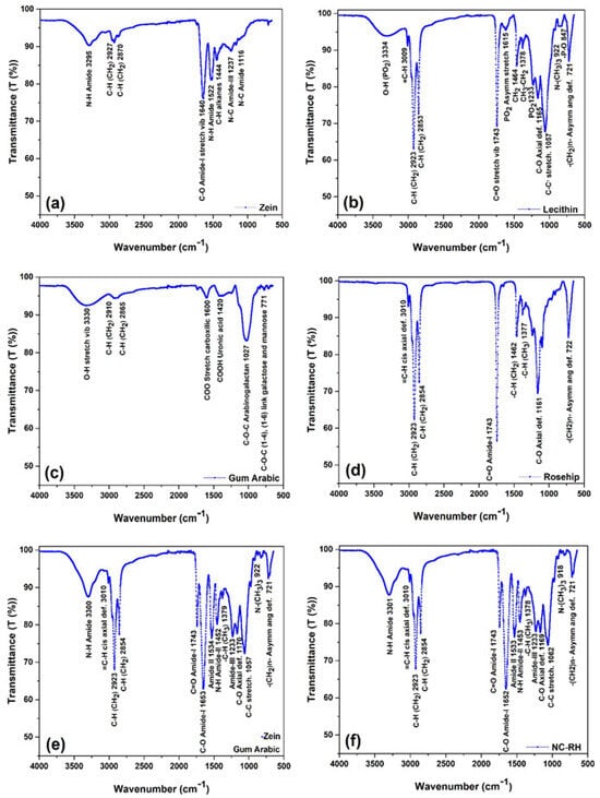 FTIR of (a) zein; (b) lecithin; (c) gum Arabic; (d) rosehip; (e) zein–gum Arabic; and (f) NC-RH.