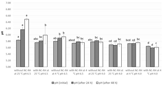 Acid marinades improve tenderness, make muscle structures more flexible, and increase the water-holding capacity. This is achieved by reducing cooking losses; improving color, juiciness, and flavor; and mitigating off-flavors [32]. Figure 4 shows the changes in meat pH from the beginning until 48 h later. First, the acid marinades decreased the meat pH after marination and before 48 h in the treatment with NC-RH at pH 4.0. It is worth noting that the acid marinade favors pork meat preservation, decreases the vulnerability to microbial growth, and facilitates the action of collagenases alongside enzymes associated with meat tenderization [33].