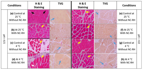 Figure 5 shows the images obtained in the histological test and the different applied treatments. The control samples were only immersed in a surfactant solution, and the other samples were applied with NC-RH, both conditions at different pH levels (6.5 and 4.0) and temperatures (25 °C and 4 °C) after 48 h. In the control (Figure 5a) at pH = 6.5 and 25 °C, the tissue structure is organized and characterized by the presence of muscle fibers delimited by the connective tissue surrounding the muscle fiber that makes up the endomysium (Figure 5a, black arrows). This makes the separations visible, generating a well-organized tissue structure [39].