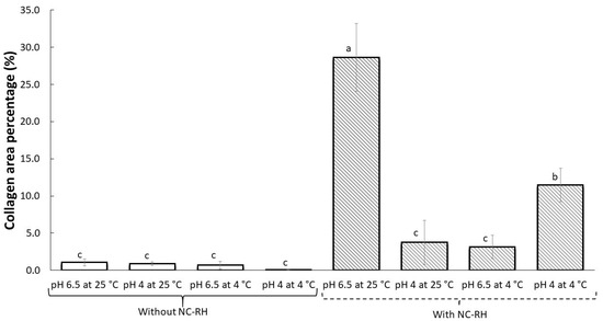 Figure 6 shows the collagen area percentage quantified transversally. When the NC-RH were applied, the highest percentage of collagen was obtained (28.63 ± 4.6% area of collagen) at pH 6.5 and 25 °C. However, this increment could have the opposite effect on tenderness, making the meat harder. At pH 4 and 4 °C, there was an 11.47 ± 2.2% area of collagen, representing a better quantity of collagen. It was demonstrated that the transverse breaking stress of meat, which reflects connective tissue strength, decreases in pH, and cannot be explained only by swelling. This suggests the significant weakening of connective tissues at low pH levels [7].