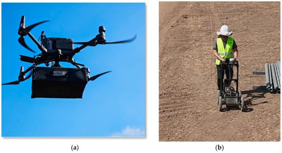 Two types of GPR instruments at the site under study. (a) A DJI M-300 drone with a GPR 500 MHz shielded dipole antenna is attached below. The SkyHub computer, which is positioned on the right side, is responsible for controlling the automatic flight operations. At the front of the drone, an altimeter measures the distance from the ground, maintaining a constant flight altitude. (b) An intelligent cart with a GPR 500 MHz shielded dipole antenna is attached in the middle. Both GPRs provide similar subsurface sensing capabilities up to 5 m below the surface.