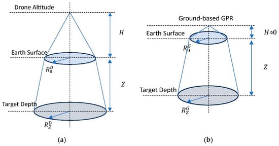 The scheme for calculating the GPR parameters: (a) drone-based GPR, and (b) land-based GPR.