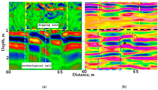 Figure 6 displays zoomed-in fragments of the radargrams extracted from a drone-based (a) and ground-based (b) GPR survey line. The X and Y axes represent the line distance along the Earth’s surface and the measurement depth in meters, respectively. A discernible change between two geological layers is evident approximately 1 m below the surface, demarcated by a black dashed line. The upper soil exhibits a softer composition, characterized by the faster decay of the electromagnetic waves, resulting in a low-amplitude representation depicted with weak and blurred colors. Below this depth, a pronounced amplification reveals a denser layer. Several heterogeneous anomalies are observed within the upper soil layer, particularly around 0.3 m deep, indicating irregularities near the surface. These anomalies suggest that the terrain may not have been uniformly flat and might have undergone alterations for construction purposes, leading to localized soil ‘pockets’ near the surface, as delineated by a yellow dashed line. In the lower soil layer, distinct changes in the horizontal electromagnetic phases are noted at approximately 62–63 m of the profile length, accompanied by heightened amplification. This pattern suggests the presence of objects composed of stiffer materials, likely artificial structures such as archaeological walls made of limestone boulders, marked by a light blue dashed line. Note that the corresponding structural elements on both radargrams are emphasized by circles and dashed arrows.
