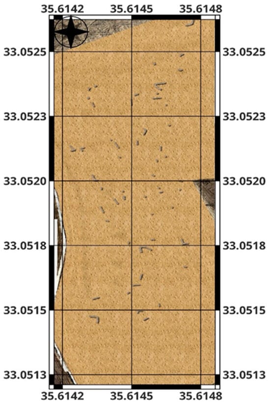 Figure 8 shows the numerical mapping of the overlapping findings. The locations and shapes of the findings are irregular and randomly scattered across the site. Such a feature of the outcomes suggests the relation to the Early Bronze Age. This era was characterized by structures crafted from irregularly broken limestone and sandstone boulders intricately assembled into wall-like structures, as highlighted in the preceding introduction. The unique scattering pattern observed in this mapping aligns with the archaeological understanding of construction practices during the Early Bronze Age in the Hulata region.