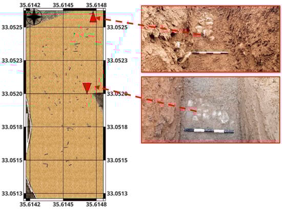 This study’s results (Figure 8) show that the target archaeological artifacts are scattered underground throughout the entire site, typically at depths of approximately 1–2 m. The Archaeological Authority of Israel (AAI) conducted precise experiential excavations at several suspected points of interest within the site area and a few attempts outside the GPR-investigated area. Two examples of shallow and short trenches, the photos of which are incorporated into Figure 9, were dug to a depth of 2 m. The archaeological findings align with the geophysical survey results, indicating that archaeological artifacts are located at depths estimated by the GPR findings. These artifacts consist of randomly shaped structures made mainly of boulders, with a density higher than the surrounding soil. This correlation reinforces the accuracy and reliability of our geophysical survey in identifying archaeological features within the Hulata solar panel construction site.