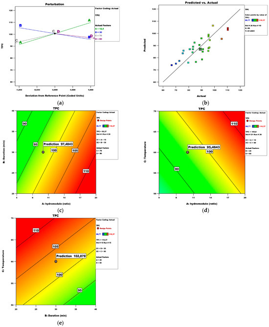 TPC model analysis: (a) Perturbation plot; (b) predicted vs. actual plot; (c) contour surface plots of TPC against hydro module (ratio) and duration (min); (d) contour surface plots of TPC against hydro module (ratio) and temperature; (e) contour surface plots of TPC against duration (min) and temperature.