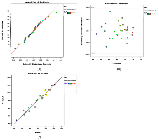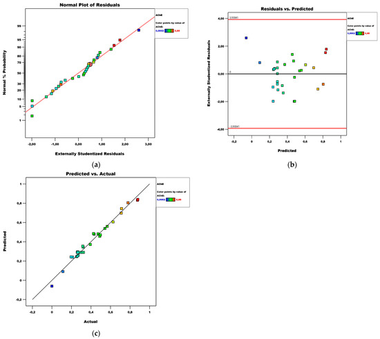 Diagnostics of the DPPH model: (a) normal plot of residuals; (b) residuals vs. predicted plot; (c) predicted vs. actual plot.