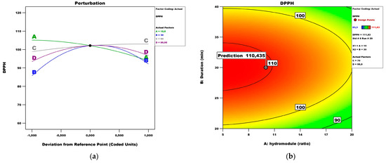 Figure 7 presents the perturbation and contour plots. The perturbation plot (Figure 7a) showed that the extractant and duration have the most significant influence, while the impact of temperature had no effect. Figure 7b revealed the effect of the hydro module and duration on the DPPH antioxidant activity of peach fruits while keeping temperature and extractant at values of 70 °C and 99.9%, respectively.