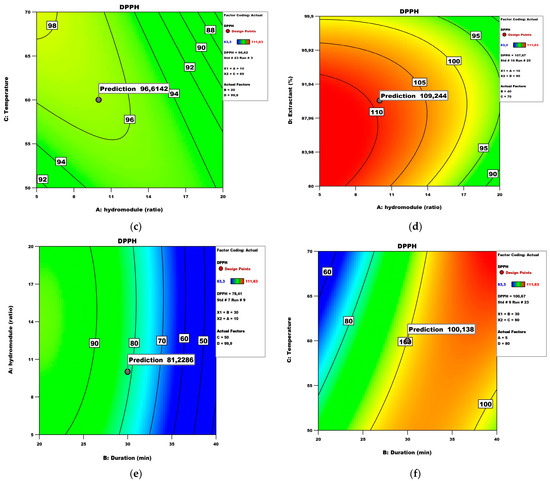 DPPH model analysis: (a) Perturbation plot; (b) contour surface plots of DPPH against hydro module (ratio) and duration (min); (c) contour surface plots of DPPH against hydro module (ratio) and temperature; (d) contour surface plots of DPPH against hydro module (ratio) and extractant; (e) contour surface plots of DPPH against duration (min) and hydro module (ratio); (f) contour surface plots of DPPH against duration (min) and temperature.