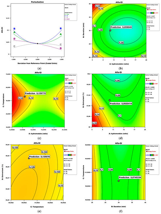 α-glucosidase inhibition model analysis: (a) Perturbation plot; (b) contour surface plots of Alfa-Gl against hydro module (ratio) and duration (min); (c) contour surface plots of Alfa-Gl against hydro module (ratio) and temperature; (d) contour surface plots of Alfa-Gl against hydro module (ratio) and extractant; (e) contour surface plots of Alfa-Gl against temperature and extractant; (f) contour surface plots of Alfa-Gl against duration (min) and temperature.