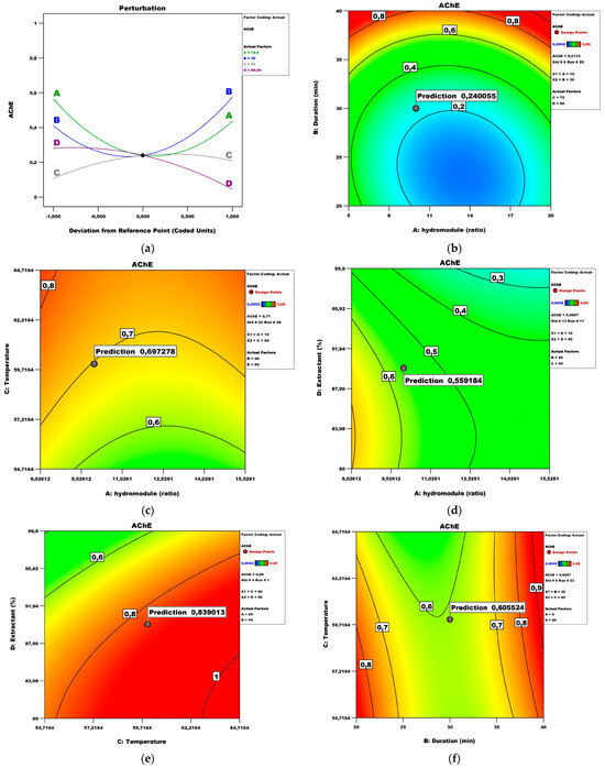 AChE inhibition model analysis: (a) Perturbation plot; (b) contour surface plots of AChE against hydro module (ratio) and duration (min); (c) contour surface plots of AChE against hydro module (ratio) and temperature; (d) contour surface plots of AChE against hydro module (ratio) and extractant; (e) contour surface plots of AChE against temperature and extractant; (f) contour surface plots of AChE against duration (min) and temperature.