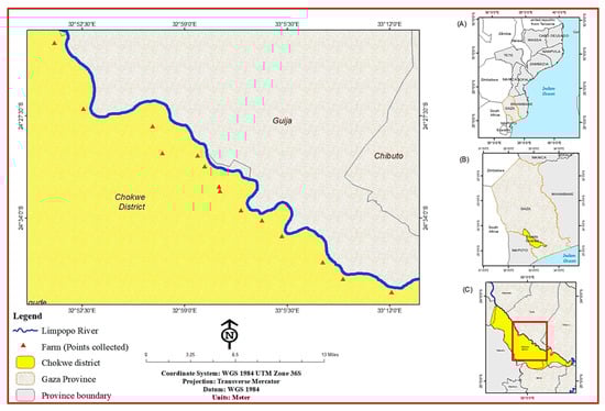 The 40 BBTV isolates used in this study were chosen proportionally to the number of isolates from 23 fields located on 11 farms in the 4 administrative posts of the Chókwè district (initial site of the outbreak), province of Gaza (Figure 1B) in Mozambique (Figure 1A), with the help of researchers from the Institute of Agricultural Research of Mozambique (IIAM) and commercial and family farmers involved in banana production. Located in southern Gaza, the district of Chókwè (Figure 1C) has the following geographical coordinates: 24°05′ and 24°48′ south latitude; 32°33′ and 33°35′ east longitude [22].