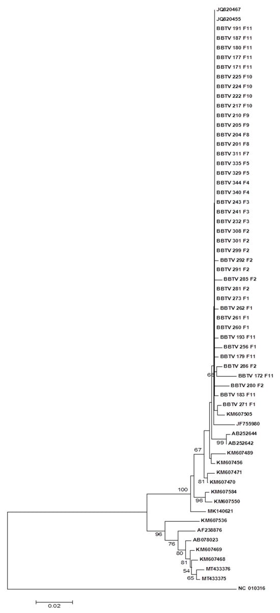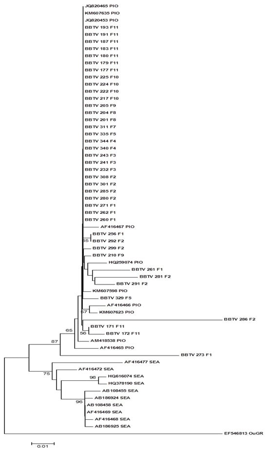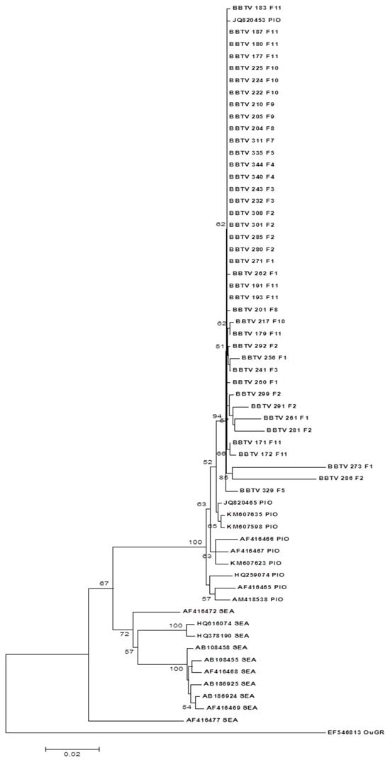 In phylogenetic studies performed by Karan et al. [39] and reviewed by Yu et al. [20], the classification of BBTV isolates, based on nucleotide sequences, into two groups, the South Pacific group and the Asian group, was proposed. The Mozambican isolates showed higher identities with isolates from the PIO group, between 97% and 99%, and the lowest identities with the isolates from the SEA group, between 90% and 92%, indicating that the Mozambican isolates belong to the first group. These results were corroborated by the distribution of the isolates in the phylogenetic tree based on nucleotide sequences, which showed a clear subdivision of the isolates into two distinct clades, with all the Mozambican isolates grouped together with the isolates of the PIO group. Other authors studying isolates from different African countries also reported that the isolates belonged to the PIO group [21,37,38,40,41,42,43].