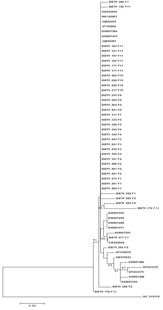 Phylogenetic tree constructed based on the nucleotide sequence of the R-DNA of BBTV isolates collected in the district of Chókwè, Mozambique and isolates from GenBank. Bootstrap values were obtained using the MEGA7.0 neighbor-joining program with 2000 repetitions.