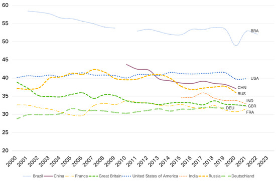 Gini coefficients of different countries from 2000 to 2023 (unit: %; some of the data for certain years are incomplete). Data source: the official website of the World Bank.