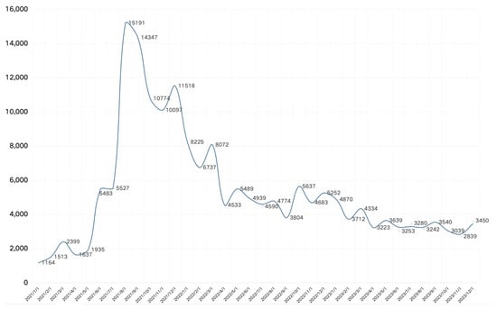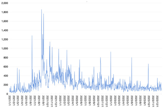 As shown in Figure 4, the temporal trend in the volume of Weibo posts related to common prosperity reveals significant fluctuations over the period studied. In 2021, there were 103,623 posts concerning common prosperity, and this number slightly increased to 105,488 posts in 2022. However, there was a noticeable decline in 2023, with the count dropping to 54,282 posts. Figure 5 illustrates the daily distribution of these posts, providing insight into engagement levels over time.