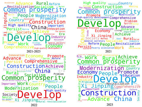 Figure 6 presents word clouds depicting the top 50 high-frequency words for each year, offering a visual representation of the key terms associated with discussions on common prosperity. These visualizations highlight that the predominant strategy for promoting common prosperity in China is focused on development, frequently described as “enlarging the economic cake”. In pursuit of these developmental goals, China has enacted a variety of measures. These include strengthening the leadership role of the CPC, revitalizing the rural economy, enhancing the well-being of the populace, and deepening market reforms.