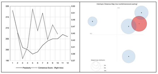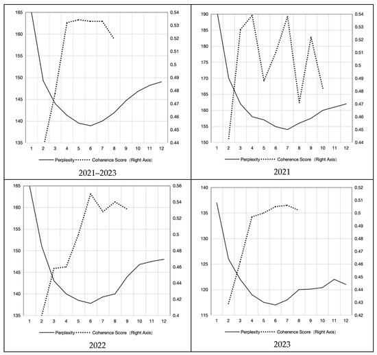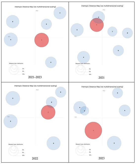 The initial step in topic analysis involved determining an appropriate number of topics. Our study conducted a comparison of perplexity scores and coherence scores for different numbers of topics. The lower the perplexity score, and the higher the coherence score, and the more reasonable the number of topics. The review of the perplexity score indicates the optimal configuration of the 2021–2023 dataset. As shown in Figure 7, the lowest perplexity score occurs on six topics, where, although the coherence score is not the highest, it is only slightly lower than the highest score. If we determine the number of topics to be the five with the highest coherence score, the perplexity score will increase significantly, indicating that it is appropriate to determine the number of topics as six (as shown in Figure 8, the intertopic distance map of topic modeling also indicates that the number of six topics is appropriate). Using the same method as above, the optimal number of topics is identified as seven for 2021, six for 2022, and six for 2023 (Figure 7).