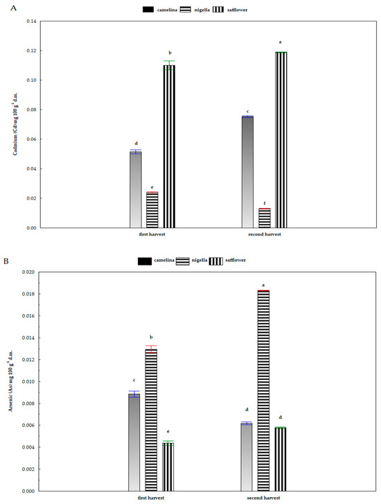 The amount of Cd (cadmium) in the microgreens ranged from 0.011 to 0.119 mg per 100 g d.m. (Figure 1). The highest statistically significant (p ≤ 0.05) amount of Cd was determined in the microgreens of safflower from the second harvest, while the lowest was in those from the first harvest, compared to the other plants analysed. The microgreens of safflower from the second harvest contained 12 times more of this toxic element than the microgreens of nigella from the first harvest. The content of As (arsenic) in the analysed microgreens of uncommon oilseed plants ranged from 0.004 to 0.018 mg per 100 g dry matter (d.m.) (Figure 1). The highest statistically significant (p ≤ 0.05) amount of As was determined in the microgreens of nigella from both the first and second harvests, compared to the remaining plants analysed. When compared to the microgreens of safflower from the first harvest, the As content in the microgreens of nigella from the second harvest was 4.5 times higher. The content of Pb (lead) in the examined microgreens ranged from 0.006 to 0.083 mg per 100 g d.m., and the microgreens of safflower from the first harvest contained 13 times less Pb than the microgreens of nigella from the second harvest (Figure 1).