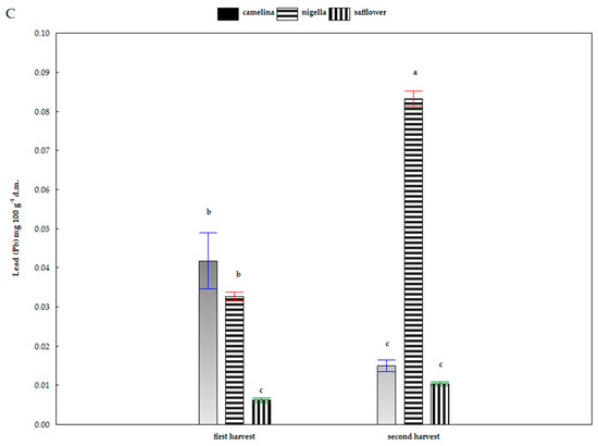 Cadmium (A), arsenic (B) and lead (C) contents in the young shoots of nigella (Nigella sativa L.), safflower (Carthamus tinctorius L.) and camelina (Camelina sativa L.) at different stages of vegetation (mg 100 g−1 dry matter—d.m.). Different letters (a–f) above the bars indicate statistically significant difference at p ≤ 0.05.
