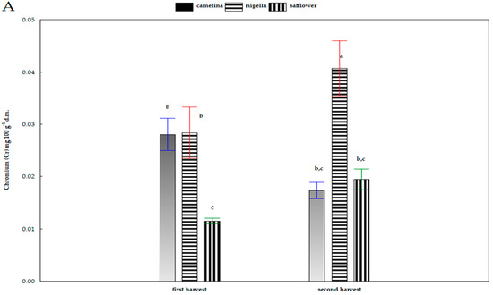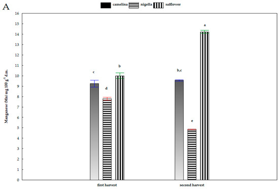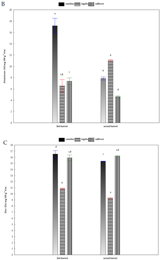 The Zn content in the microgreens of camelina from the first harvest was about 1.78 times higher than that in the microgreens of safflower (Figure 2). In contrast, in the microgreens of safflower from the second harvest, the Mn content was about 66% higher than that in the microgreens of nigella from the second harvest (Figure 4). These differences were generally statistically significant (p ≤ 0.05).