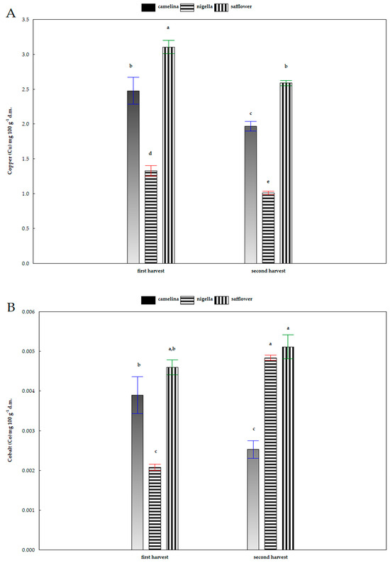 The contents of Zn (zinc), Cu (copper) and Mn (manganese) in the microgreens of rare oilseed plants were, respectively, 9.28–16.51; 1.01–3.10 and 4.84–14.22 mg/100 g d.m., and these were statistically significantly different (p ≤ 0.05) (Figure 2, Figure 3 and Figure 4). The lowest statistically significant (p ≤ 0.05) amounts of Zn, Cu and Mn were determined in the microgreens of nigella from both the first and second harvests, compared to the other microgreens (Figure 2, Figure 3 and Figure 4). As for Cu, there was 68% less of this element in the microgreens of nigella than in the microgreens of safflower from the first harvest (Figure 3).