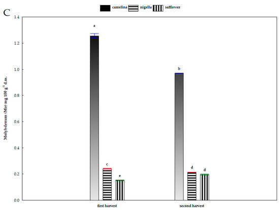 Copper (A), cobalt (B) and molybdenum (C) contents in the young shoots of nigella (Nigella sativa L.), safflower (Carthamus tinctorius L.) and camelina (Camelina sativa L.) at different stages of vegetation (mg 100 g−1 dry matter—d.m.). Different letters (a–e) above the bars indicate statistically significant difference at p ≤ 0.05.