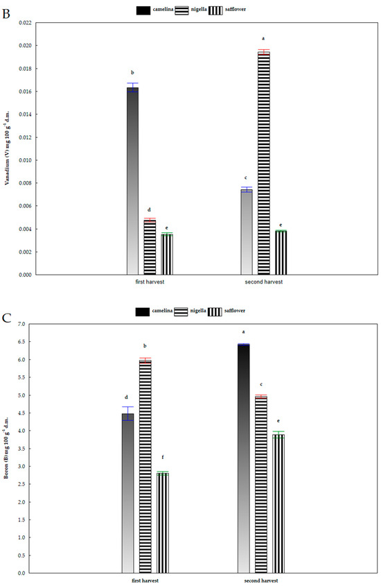 Manganese (A), vanadium (B) and boron (C) contents in the young shoots of nigella (Nigella sativa L.), safflower (Carthamus tinctorius L.) and camelina (Camelina sativa L.) at different stages of vegetation (mg 100 g−1 dry matter—d.m.). Different letters (a–f) above the bars indicate statistically significant difference at p ≤ 0.05.