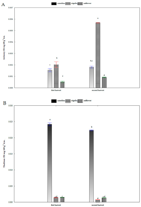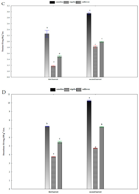 Antimony (A), thalium (B), titanium (C) and strontium (D) contents in the young shoots of nigella (Nigella sativa L.), safflower (Carthamus tinctorius L.) and camelina (Camelina sativa L.) at different stages of vegetation (mg 100 g−1 dry matter—d.m.). Different letters above the bars indicate statistically significant difference at p ≤ 0.05.