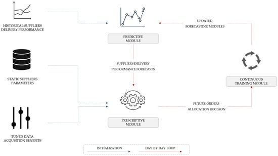 Lastly, the continuous training module will adopt new collected supplier delivery punctuality data to update the forecasts released from the predictive module over time. Indeed, as time passes, order decisions translate into real purchasing orders and consequently into new supplier deliveries whose punctuality can be recorded. Suppose orders will be allocated to a specific supplier. In that case, the continuous training module will update the predictive model related to the specific supplier with the new data, and new forecasts related to the supplier’s future delivery performance will be provided as new input to the prescriptive module. On the other hand, if no order is allocated to a specific supplier, its forecast will not be updated.