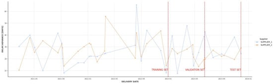 The experimental setup remained consistent across all the eight components outlined in Section 3.2.1. The historical data of the delivery performance reported by each supplier for a specific component are divided into three consecutive subsets, as illustrated in Figure 2.