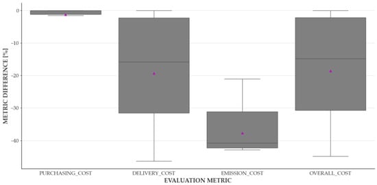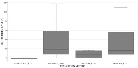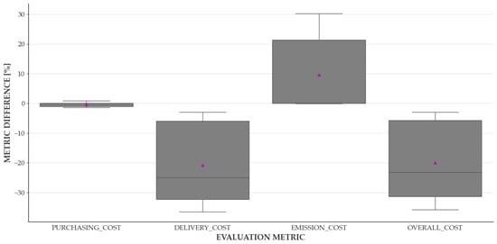 According to their formulations, Equations (7)–(10) thus represent the difference between the purchasing cost, the delivery cost, the order emission cost, and the overall cost, respectively, following the decision suggested by the proposed approach and the decisions made following one of the benchmark approaches. The difference is expressed as a percentage of the cost reported by the benchmark approach. A positive value reported in Equation (11), for example, thus represents that the proposed approach led to a higher overall cost value than the benchmark.
