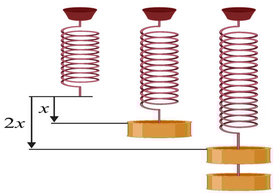 Hooke’s law, an elasticity principle formulated by the English scientist Robert Hooke in 1660, asserts that the displacement or size of the deformation of an item is precisely proportionate to the applied force or load, as long as the deformations are relatively modest [22,23]. Under these circumstances, the object reverts to its initial shape and dimensions once the load is removed. The elastic behavior of solids, as described by Hooke’s law, can be attributed to the proportionate relationship between the force applied to the solid and the resulting displacement of its constituent molecules, atoms, or ions from their normal positions. See Figure 1.
