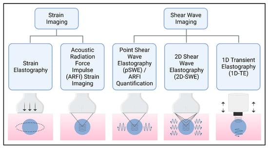 Shear wave imaging is an elastography technique that results in the generation of shear waves in perpendicular or parallel dimensions. After applying dynamic stress, researchers estimate tissue elasticity by measuring the shear wave speed qualitatively and quantitatively. Shear wave imaging is currently approached using three various techniques: one-dimensional transient elastography (1D-TE), two-dimensional shear wave elastography (2D-SWE), and point shear wave elastography (pSWE) [39,40,41,42].