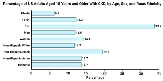 Chronic kidney disease (CKD) is a long-term and progressive disease that results in kidneys losing their ability to function properly, causing major renal damage and an inability to clean and filter the blood as well as healthy kidneys do, resulting in toxic waste and fluid accumulation that leads to potential heart disease and might eventually cause strokes and early death. CKD is primarily common among adults over 65 years old in the United States and the United Kingdom, with an estimation of 14% of patients diagnosed with CKD in the US and 10% in the UK [80,81,82]. CKD can run in families with African or Asian backgrounds and affect anyone from children to elders. Some CKD patients develop it as they grow older, while others might be born with it. Symptoms can range from mild itching and headaches to more advanced breathing difficulty due to the buildup of fluids inside the lungs. Muscle cramps and weakness, insomnia, and frequent nighttime urinating can count as CKD symptoms as well. Anybody can develop CKD, and the risk factors are influenced by many causes, such as hypertension, diabetes, the overuse of various medications, including Ibuprofen and Diclofenac, glomerulonephritis (which is an inflammation within the kidneys), and possible family history [83,84,85,86,87]. See Figure 3.
