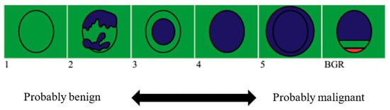 Visual representation illustrating the Tsukuba score. The lesion is depicted in an oval shape, with varying colors denoting differences in lesion stiffness in relation to the surrounding tissue. Specifically, the color blue represents increasing stiffness, while the color red represents decreased stiffness. As the Tsukuba score (ranging from 1 to 5) increases, there is an elevated likelihood of malignancy in lesions. The presence of blue, green, and red (BGR) bands exhibiting a tri-laminar pattern, as shown in the far right image, can serve as a diagnostic indicator for the presence of a cyst when visualized by various ultrasound equipment manufacturers, such as Hitachi and Toshiba [14].