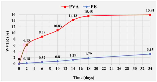 The WVTR of pure PVA film was 5.05 higher than that of the PE film on the 34th, the difference between the two films was 12.76%. Consequently, the PVA film had a higher WVP. The PVA film absorbed the most until the 18th day, then very little after that, while the PE film absorbed evenly over the 34 days. This fact is due to the hydrophilic character of PVA which, in the first phase, absorbs more water vapor, having a higher affinity with water and in the second phase, approaching the saturation state absorbs less, having fewer hydroxyl fractions available [34,35]. The difference between the WVTR values of PVA and PE films is statistically significant at 99% (p < 0.01) according to One-Way Anova, the Tukey model.