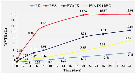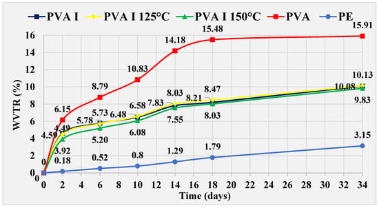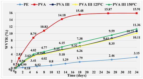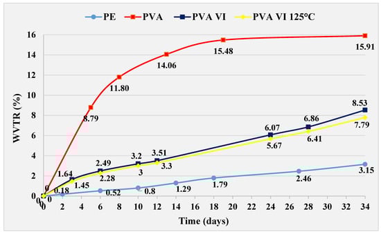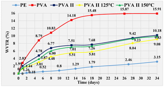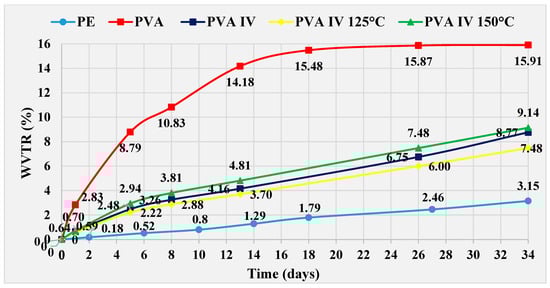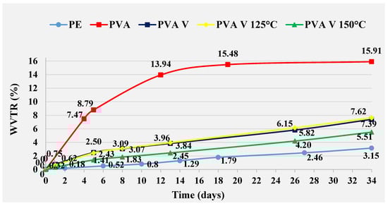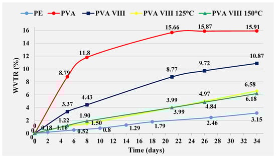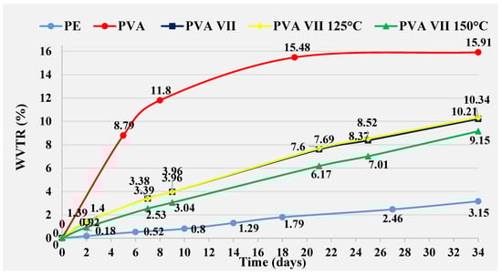 Heat treatment at 150 °C was not effective on PVA IV film, resulting in values 0.37%, higher than untreated PVA IV film at day 34. However, these are values that 6.77% lower than those achieved with pure PVA film. A PVA IV film cured at 125 °C prevents greater penetration of water through the film compared to an untreated PVA IV film. The difference recorded is 1.29%, and for pure PVA film the difference is 8.43% at day 34. The difference in WVTR values between PVA IV film treated at 125 °C and PE film is 4.33%, in favor of the PE film on the same day.